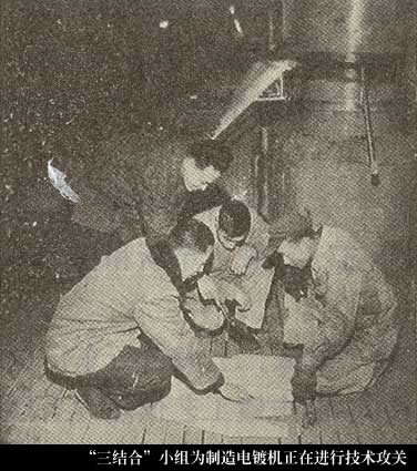 一个由车间干部、工人、技术员参加的“三结合”攻关小组,凭着长期生产实践所积累的丰富经验,相互切磋,反复商讨,终于摸索,在搭建一台机器模型的基础上,先建造出一台试验用的小型电镀机,经反复测试,取得可靠技术数据的前提下,制造出了全国第一台大型自动联合电镀机。